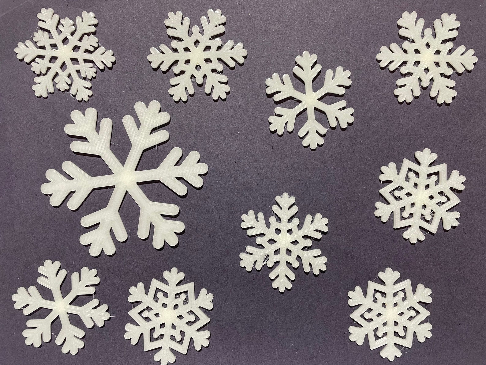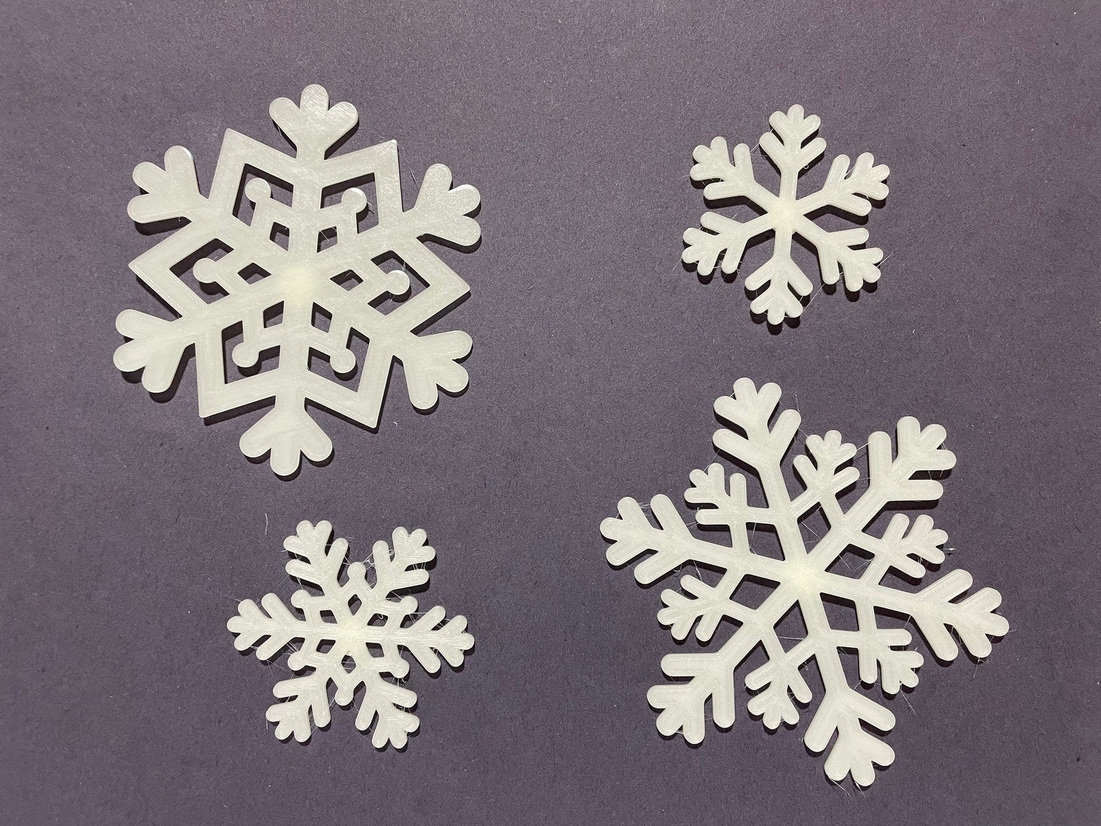 Choose from our two packages: Small Package (4 large snowflakes, 8 smaller snowflakes) or Large Package (8 large snowflakes, 16 smaller snowflakes). Each snowflake is approximately 2 inches wide for the smaller ones and 4 inches wide for the large ones.